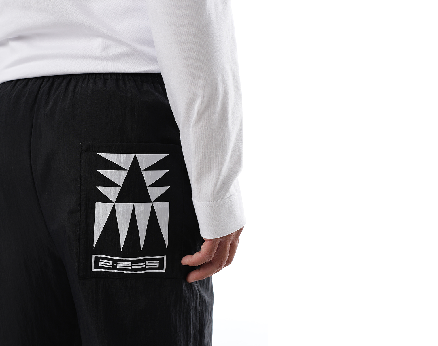 Брюки на эластичном поясе-резинке с боковыми карманами и одним накладным сзади. Модель декорирована печатью в технике DTF. Мидлфит. Черные. Состав: 75% полиамид, 25% переработанный полиамид. 96 грамм.