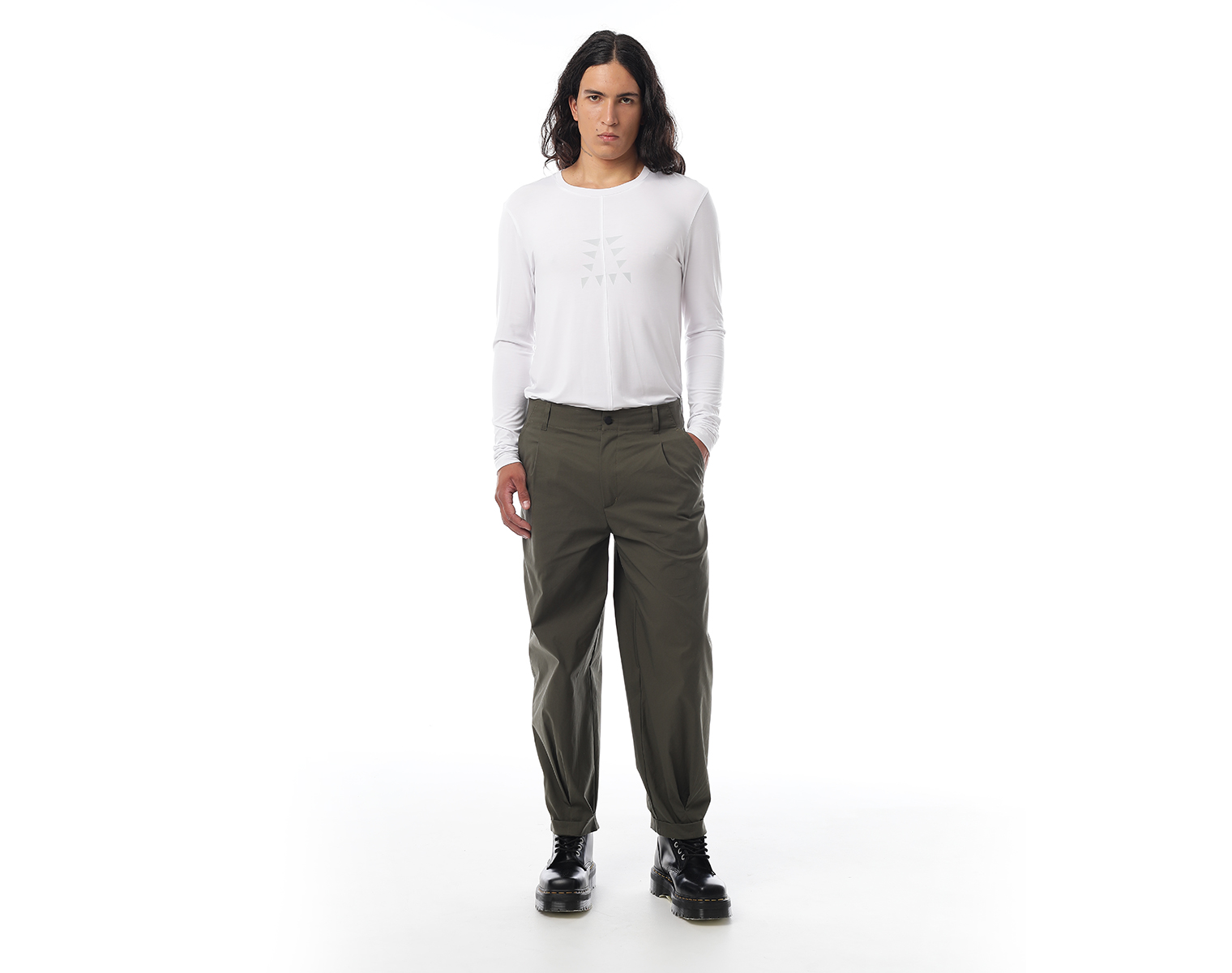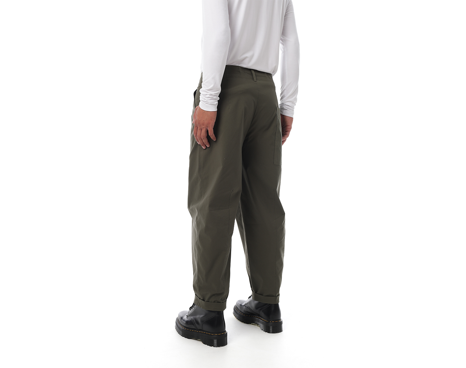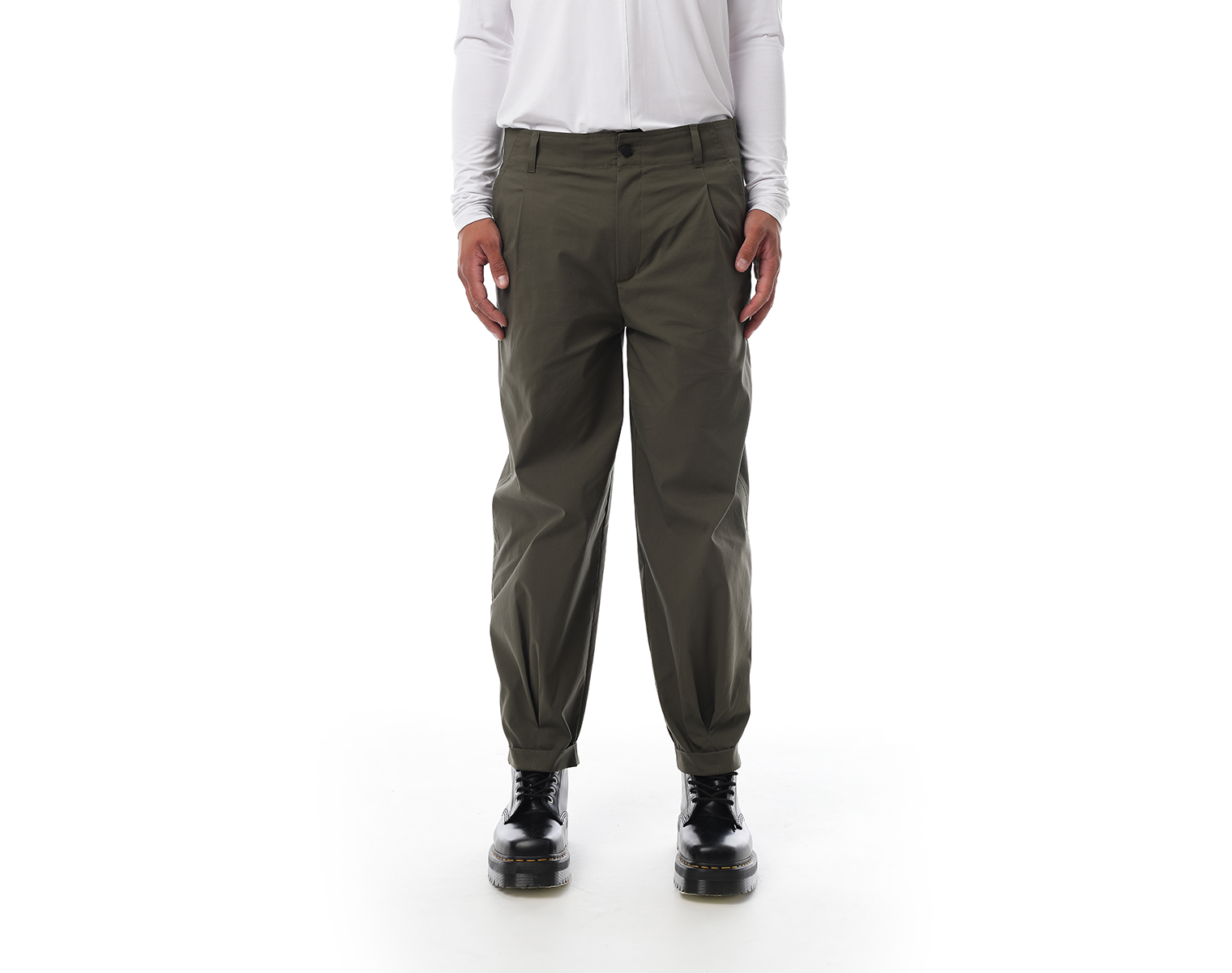 Брюки "карго" на поясе и застежкой на молнии спереди, с двумя боковыми карманами и одним накладным сзади, внизу брючины оформлены на защипах с фиксированным подворотом. Мидлфит. Хаки. Состав ткани: 100% хлопок, 220 грамм.