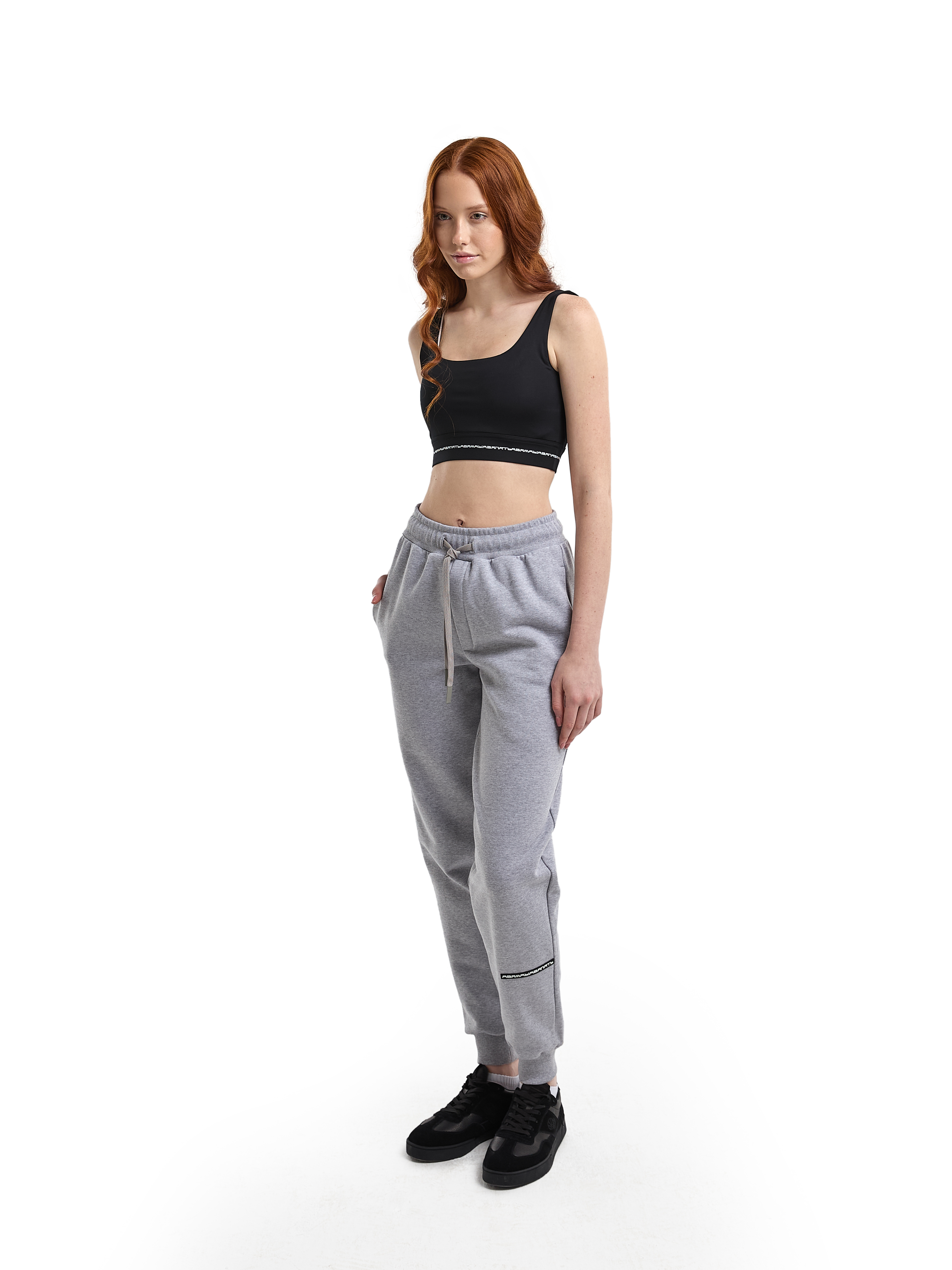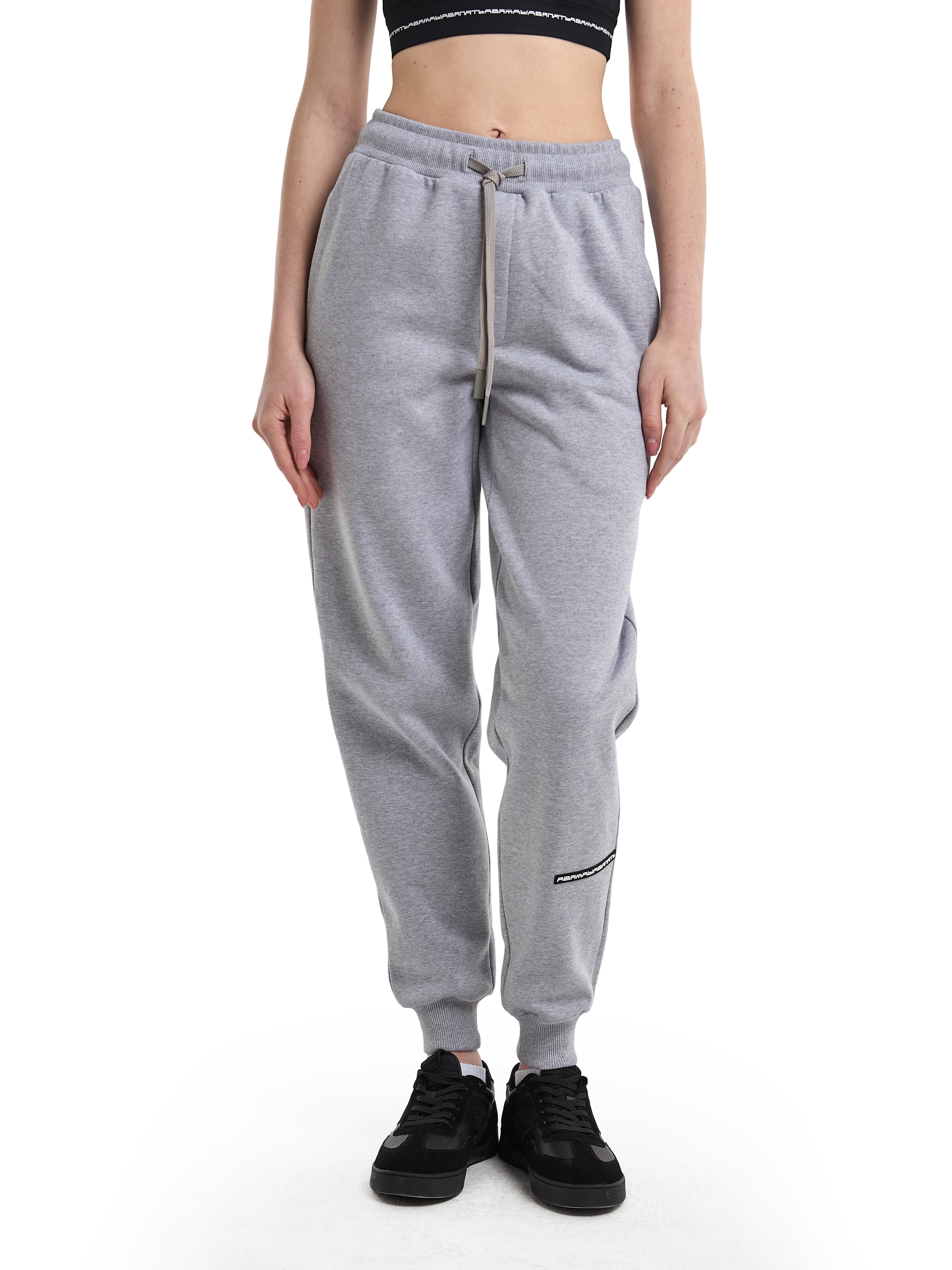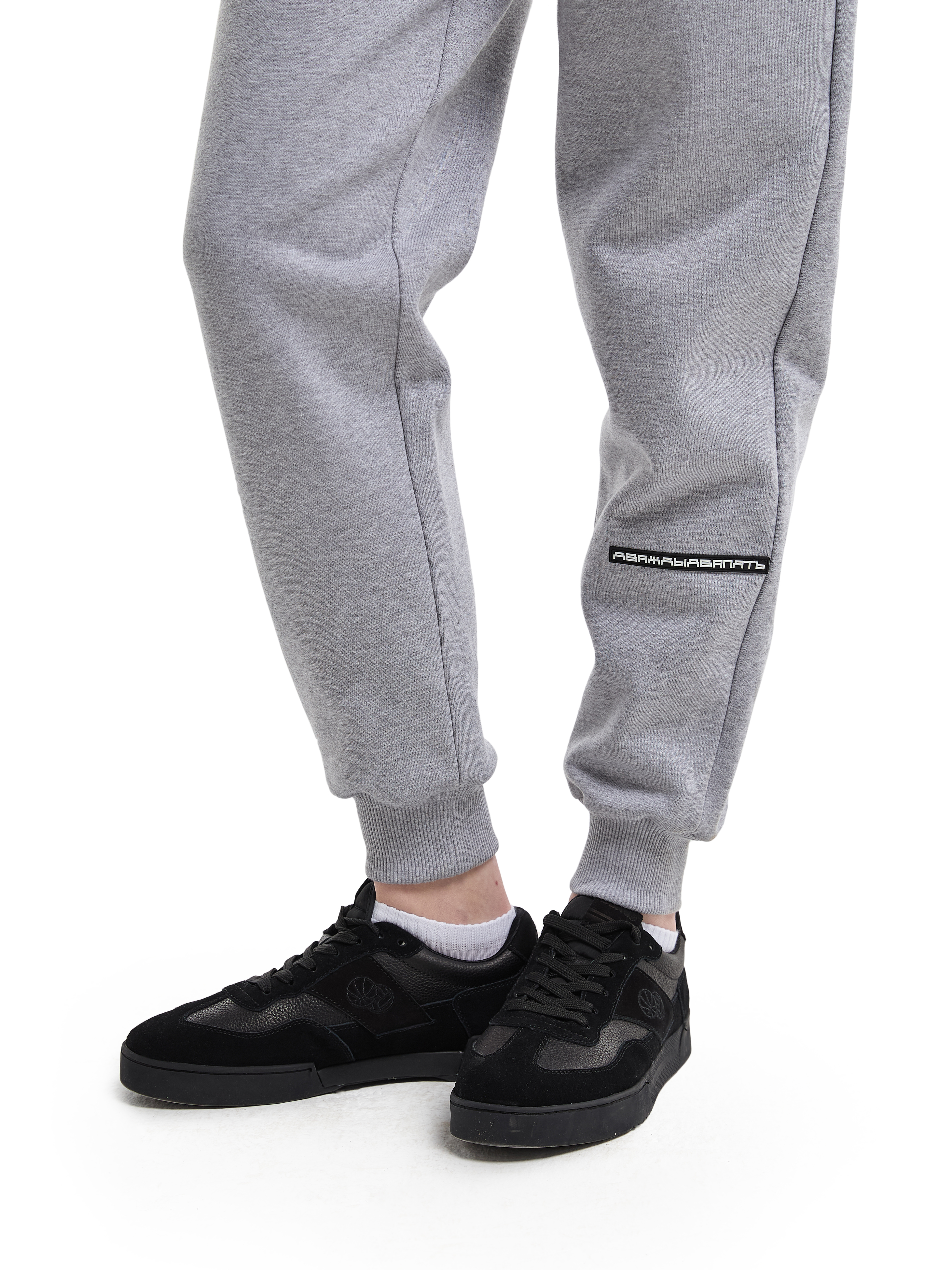 Трикотажные брюки-джоггеры на эластичном поясе-резинке и накладным карманом сзади. Серый меланж. Модель декорирована печатью в технике DTF. Мидлфит. 100% хлопок, 380 грамм.
