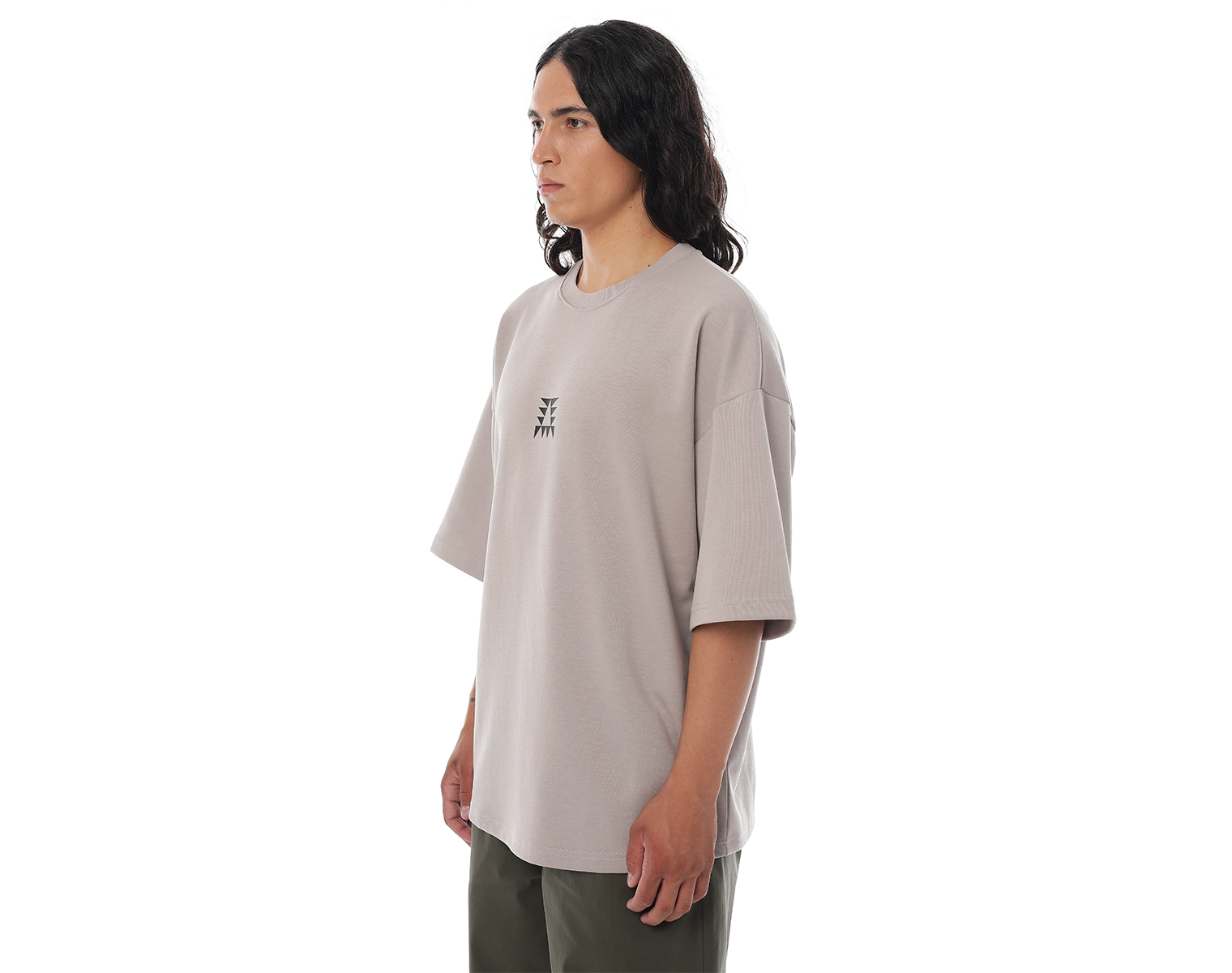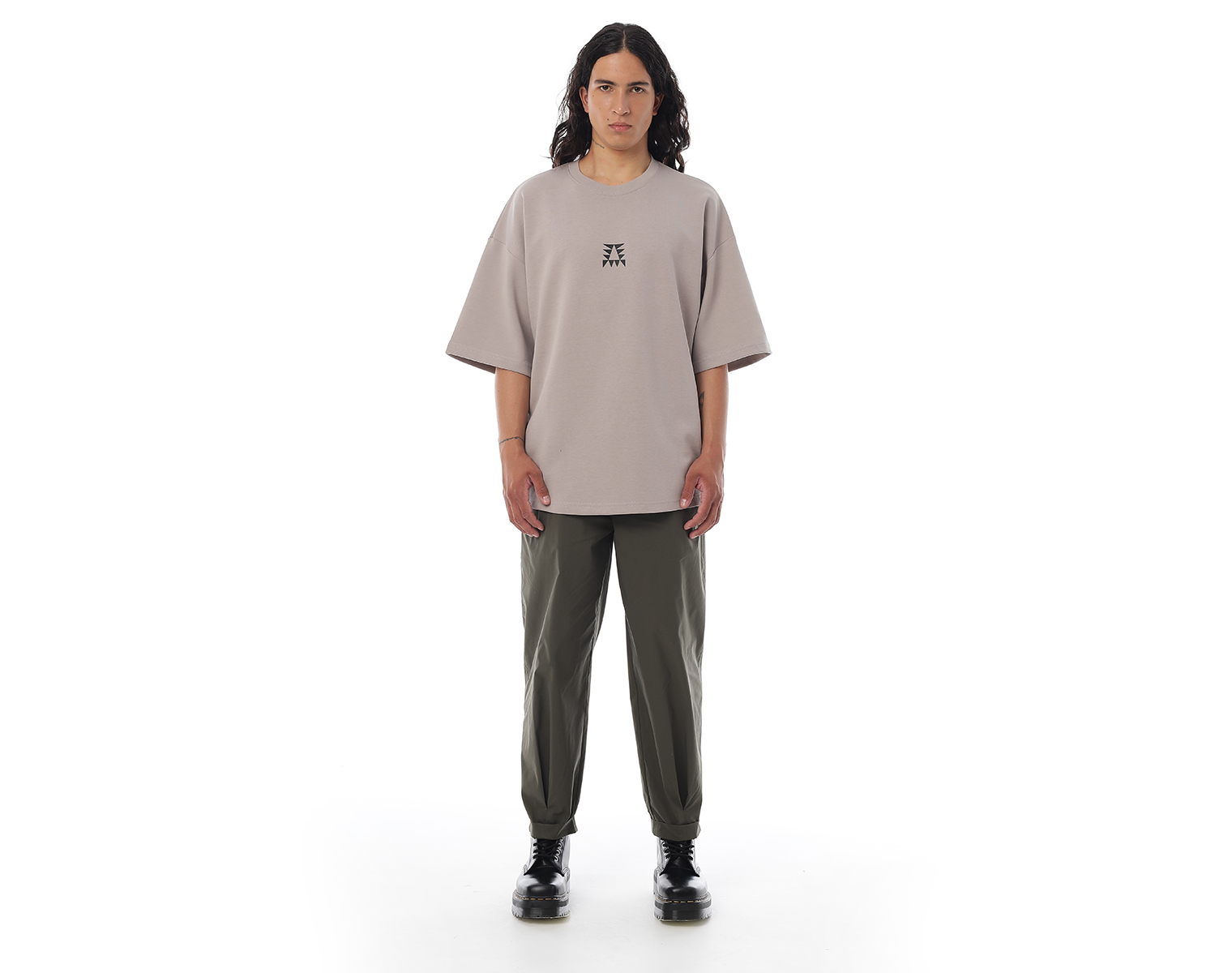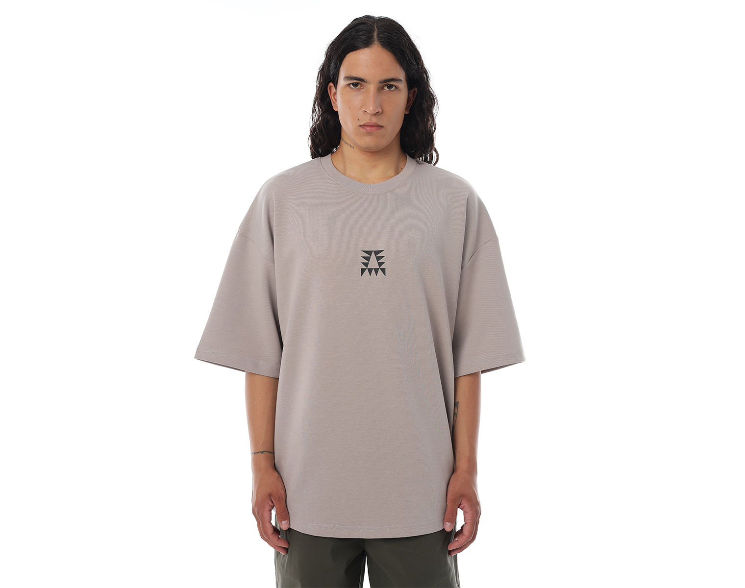 Футболка. Серо-бежевая. Посадка оверсайз. 85% хлопок 15% полиэстер, плотность 180 грамм. Модель декорирована печатью в технике DTF.