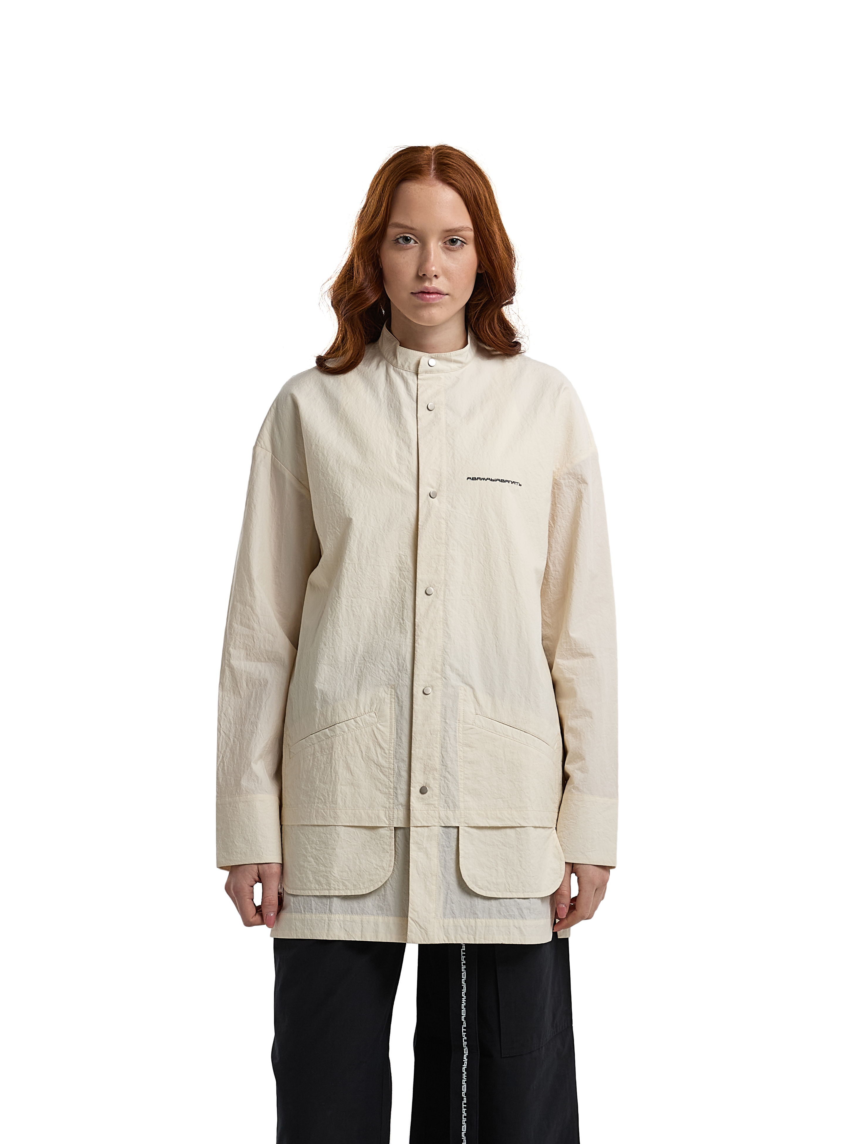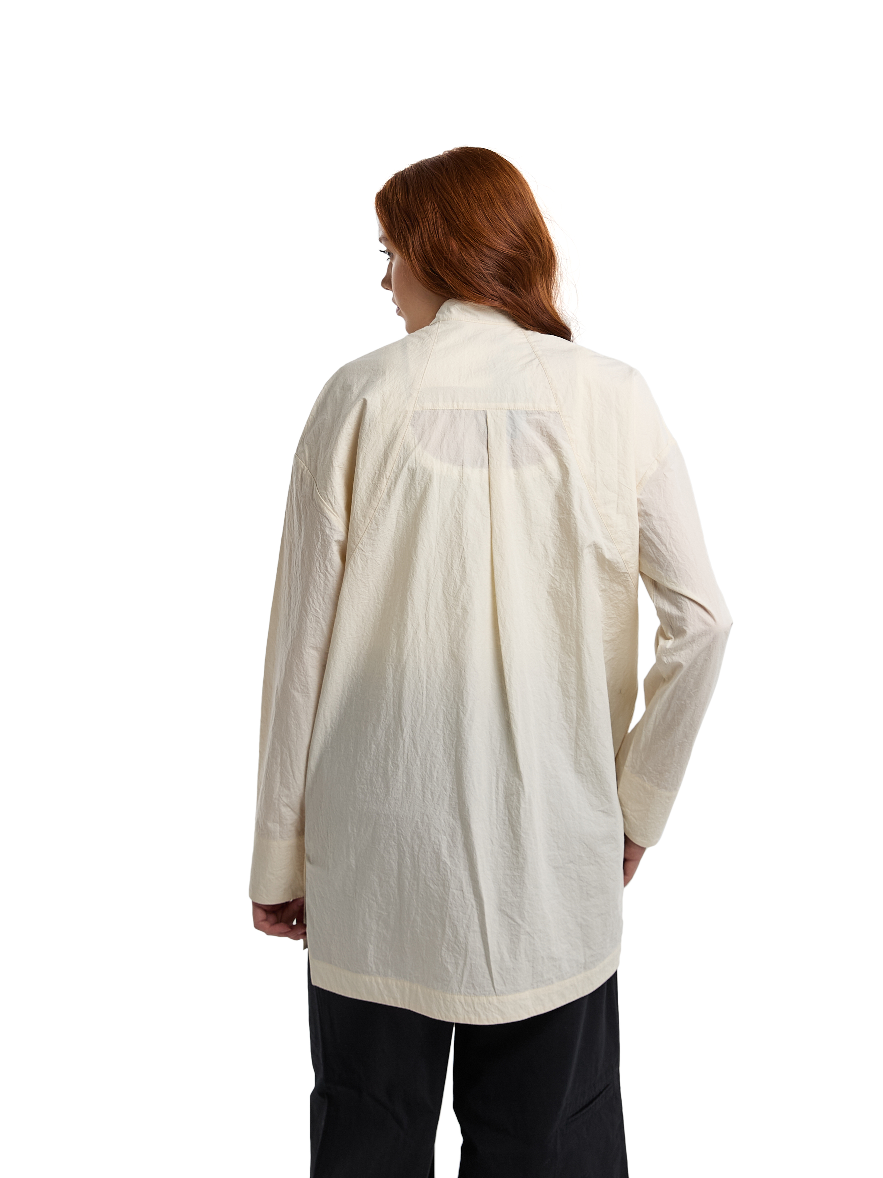 Рубашка с длинными рукавами на манжете, с двумя прорезными карманами спереди. Кремовая. Мидлфит. Модель декорирована печатью в технике "шелкография". Состав: 100% хлопок с "crash" эффектом, плотность 170 грамм.