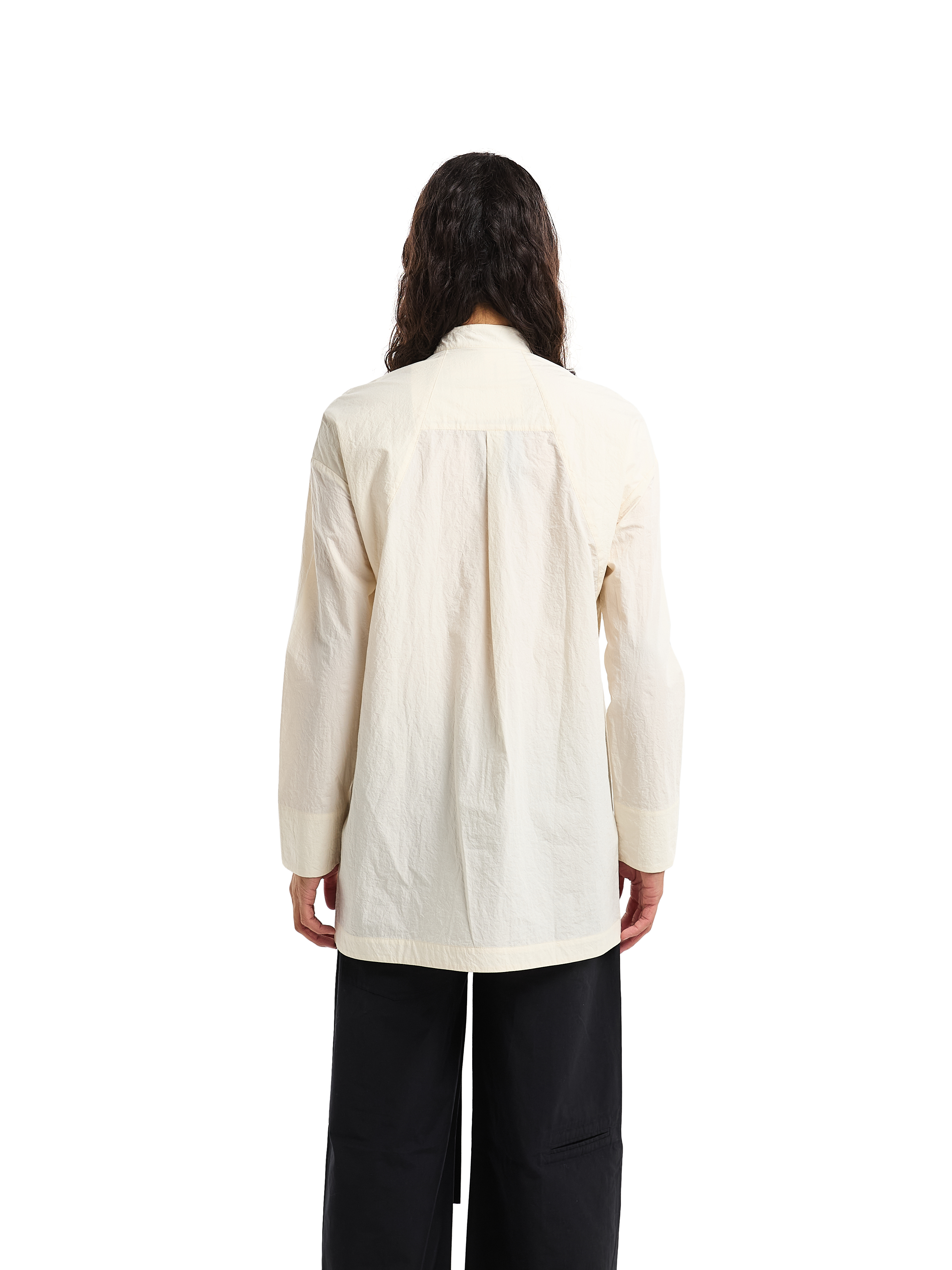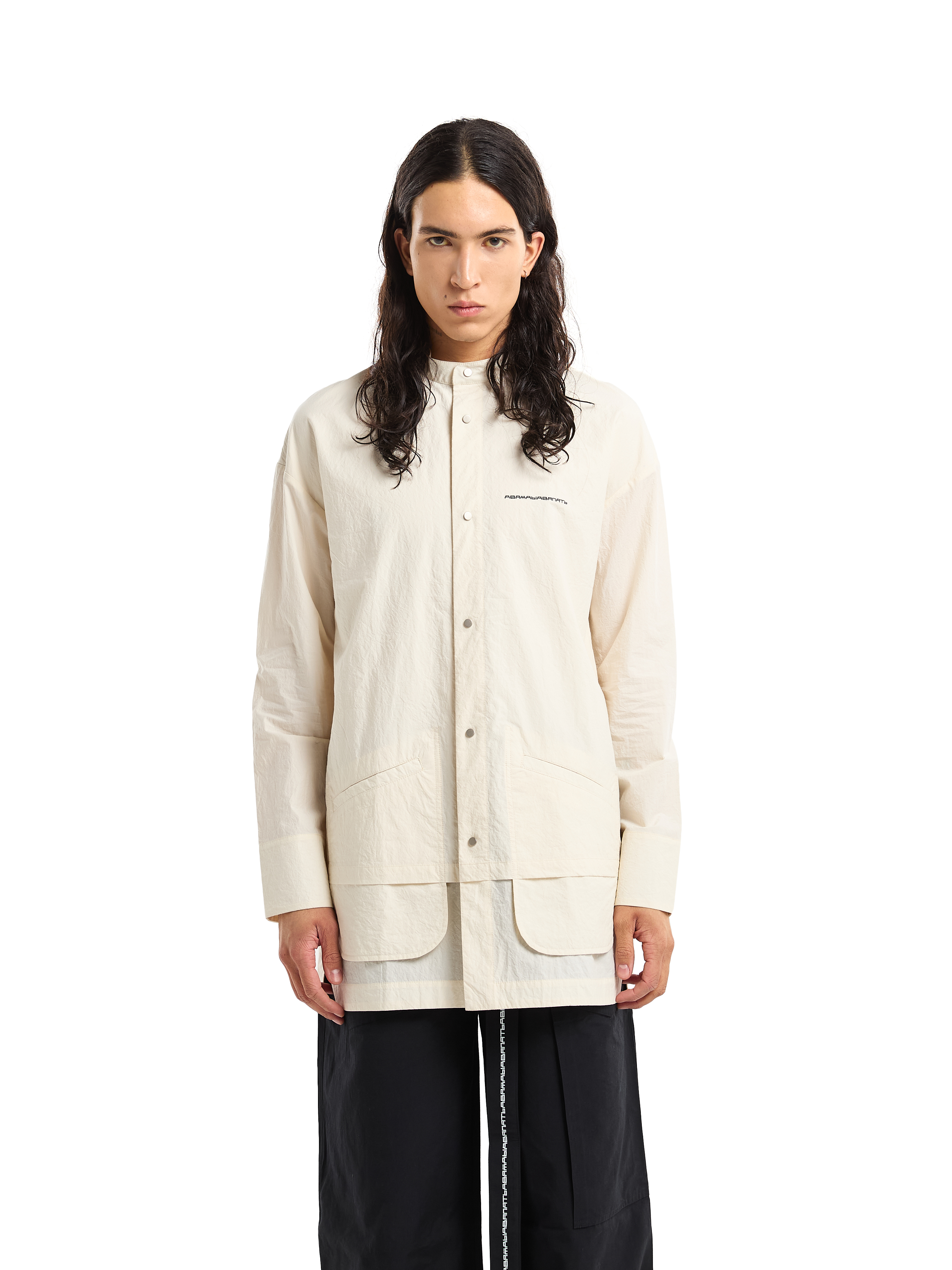 Рубашка с длинными рукавами на манжете, с двумя прорезными карманами спереди. Кремовая. Мидлфит. Модель декорирована печатью в технике "шелкография". Состав: 100% хлопок с "crash" эффектом, плотность 170 грамм.
