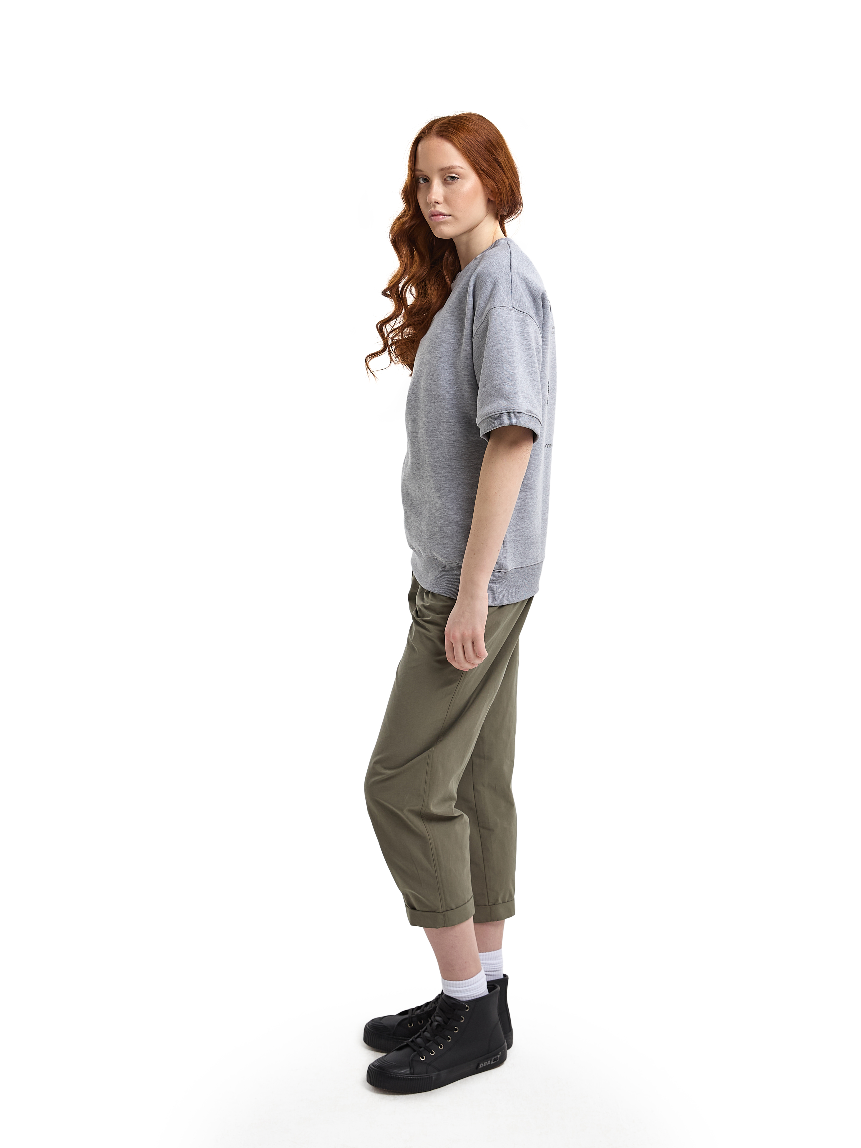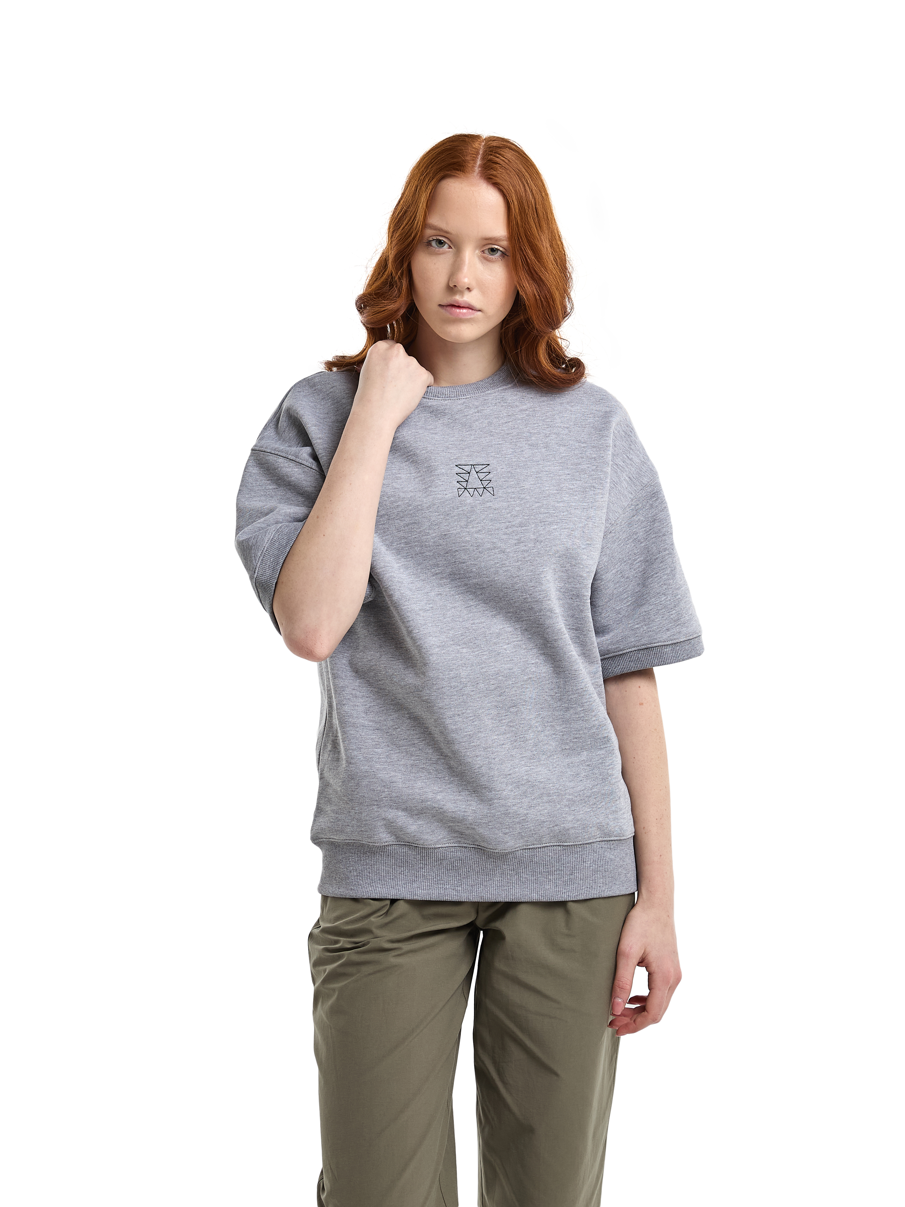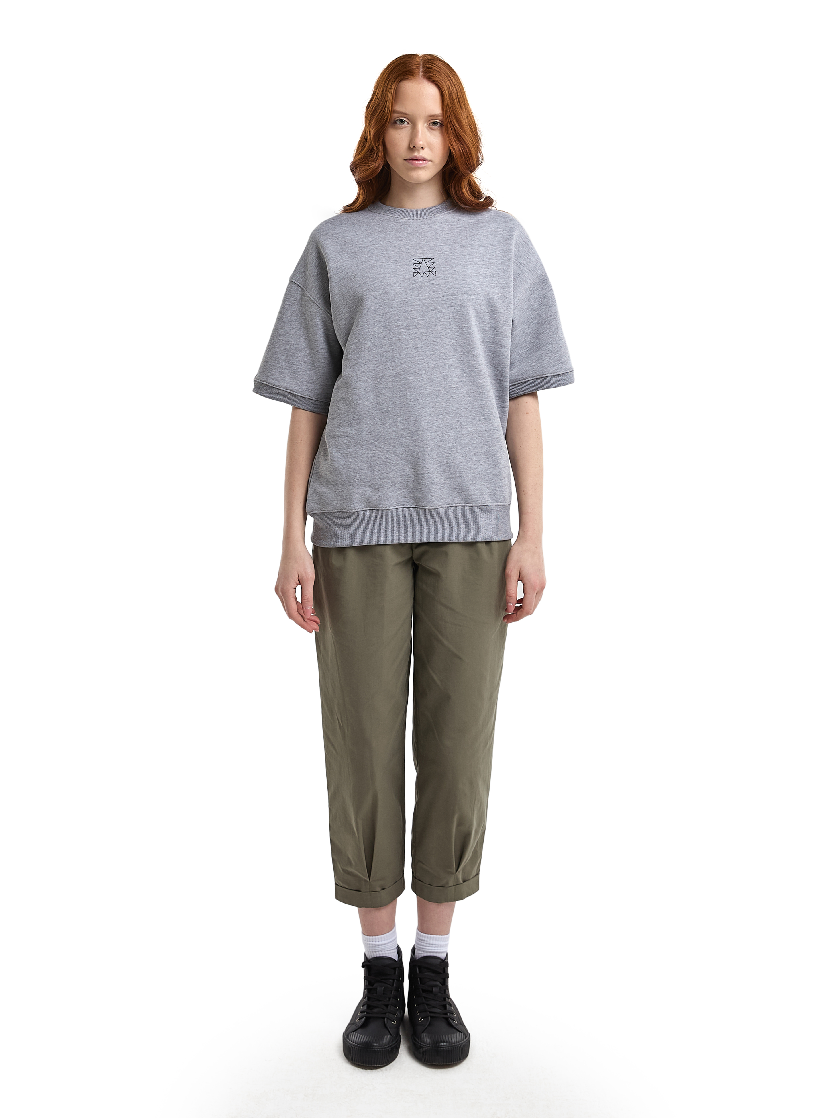 Свитшот с коротким рукавом. Светло-серый меланж. Посадка мидлфит. Футер 60% хлопок 40% полиэстер, плотность 350 грамм. Модель декорирована вышивкой в виде буквы "Д" и на спинке печатью в технике DTF.